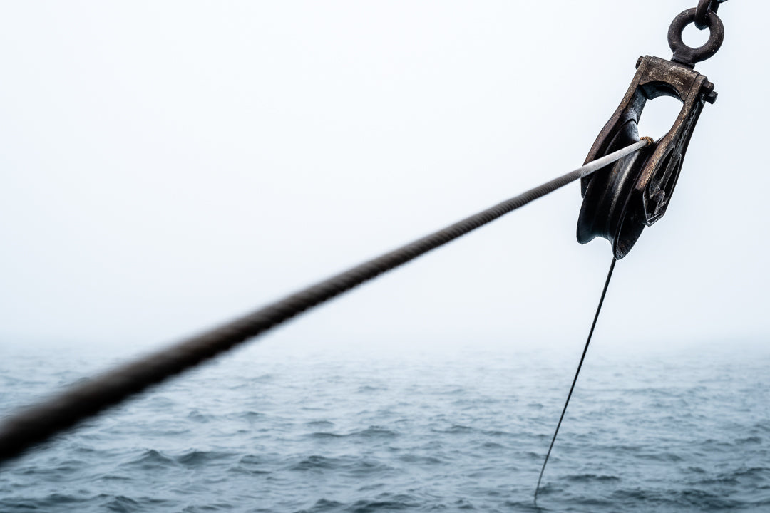 The load on the cable is as intense as the fog is thick. Detail view of rigging on board the dragger F/v Charger.